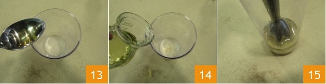 In the meantime, prepare the vegan mayonnaise: in the glass of an immersion blender, pour the soy milk and rice vinegar 13. Season with salt, then add the oil and emulsify everything 15,
