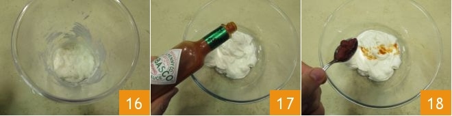 until you obtain a consistency similar to that of mayonnaise 16. Then add a few drops of Tabasco 17, a teaspoon of tomato paste 18, and mix everything together.