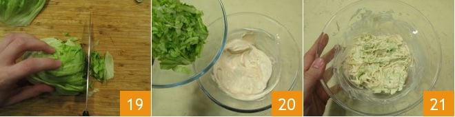 Wash the lettuce leaves, then dry them and cut them into julienne strips 19. Add them to the vegan mayonnaise 20 and mix everything together 21.