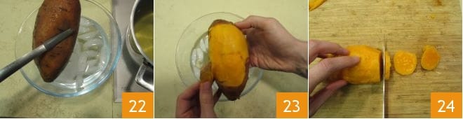 At this point, the potato should also be ready; it should be cooked but not too soft. Drain it and transfer it to a bowl with ice water for a few seconds 22. Peel it and cut it into slices about 0.6 inches thick.