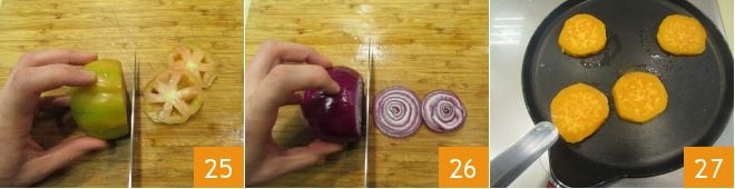 Then slice the tomatoes 25 and onions 26. Braise the potatoes on both sides in a non-stick pan 27