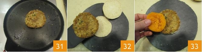 and cook it for a couple more minutes on the other side 31. Place it inside the bun 32, add the sweet potatoes 33,