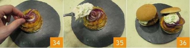 the tomato, onions 34, and the mayonnaise along with the lettuce 35. Close the bun and serve it while still hot 36.