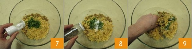then add it to the mixture, along with the salt 7 and pepper 8. Mix everything together 9, then cut out 4 squares of parchment paper about 5x5 inches.
