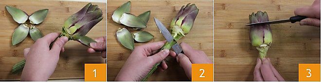 To prepare the cuttlefish with artichokes, start with the How to clean artichokes, remove the tougher outer leaves 1, then also remove the outer part of the stem and cut it a few inches below the base of the artichoke 2, also remove the tips, thus obtaining only the heart 3.