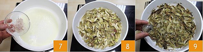 In a pan, melt the butter and add the finely chopped shallot 7, and let it wilt for 10 minutes; when it is wilted, add the artichokes 8, brown them well, salt and pepper to taste 9.