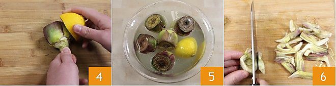 As soon as you finish cleaning an artichoke, to prevent it from darkening, rub it with half a lemon and then place it in a bowl with acidulated water (4-5), in this way you can proceed with cleaning all the artichokes without them darkening. Once the artichokes are cleaned, drain them well, cut them in half, remove the inner choke, and cut them into thin wedges 6.