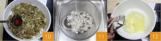 Add a ladle of broth 10 and let them cook until they become soft, then turn off the heat and set the artichokes aside. Meanwhile, wash the cuttlefish under running water and drain them well 11. Then, in another large pan, place the oil and crushed garlic (if you want to remove it later, leave it whole) 12.