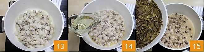 Add the cuttlefish, let them brown for 10 minutes 13, and then add the glass of wine, allowing it to evaporate 14. Cook over very low heat for 10 minutes, then add the artichokes 15 and mix everything well.