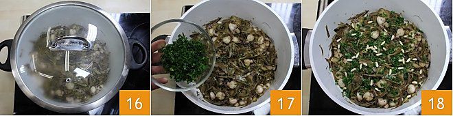 Let cook over low heat, covering with a lid until the cuttlefish become tender 16; if necessary, add a ladle of broth to prevent it from drying out. Five minutes before turning off the heat, add the chopped thyme and parsley 17, mix well, then add the pine nuts 18 and adjust the salt and pepper. Your cuttlefish with artichokes are ready to be enjoyed, serve them hot!