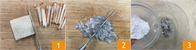 To prepare the sesame shrimp toast, start by removing the crust from the sandwich bread 1. Chop the shrimp 2, place them in a bowl, and add the cornstarch 3.