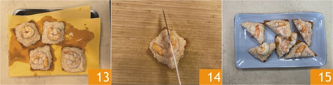 Transfer them to a tray lined with absorbent paper 13. Cut each slice diagonally to obtain two triangles 14. Your shrimp toast is ready to be served 15.