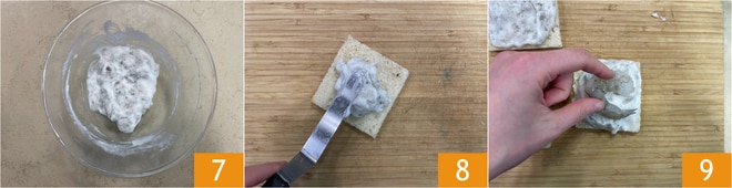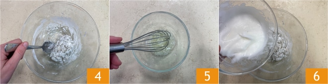 Mix and set aside 4. Then whip an egg white until stiff 5 and pour it into the bowl with the shrimp 6.