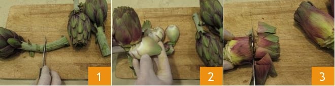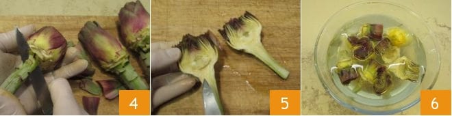 With a paring knife, remove the most superficial layer of the remaining stem, which is the most fibrous part 4, split the artichokes in half and remove the inner choke 5, as you clean the artichokes, soak them in the acidulated water you've prepared with the lemon juice 6.