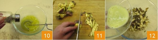 Salt and pepper 10 and set aside. Now julienne the artichokes 11, gather them in a bowl and season them with half of the citronette 12, the remaining part will be used to season the tuna.