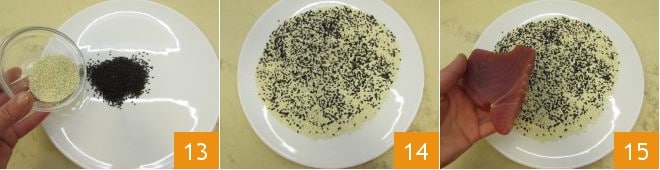 In a plate, pour the white sesame seeds and black sesame seeds 13, mix them 14. Take the tuna: we recommend ensuring the tuna you purchased has been frozen; we also advise freezing it for at least 96 hours at -0.4 degrees Fahrenheit, then thawing it before using it in the recipe. Pass the tuna slices over the seeds to coat them on both sides 15.