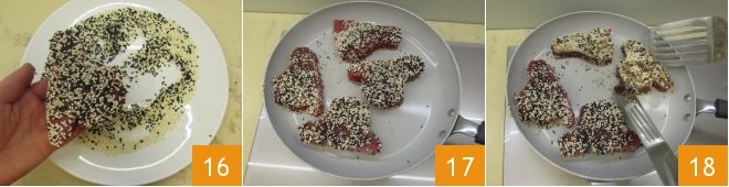 as uniformly as possible 16. Heat a non-stick pan and only when it is very hot, place the breaded tuna fillets 17 and cook over high heat for 1 minute, then turn them with a spatula 18, continue cooking for another minute. Cooked this way, the tuna will be raw inside but if you like, you can prolong the cooking time according to your taste.