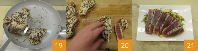 Once cooked 19, transfer the fillets to a cutting board, immediately slice them 20, and serve them immediately, garnishing the sesame tuna with the remaining citronette and accompanying it with the artichoke salad 21.