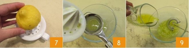 Now prepare the citronette. Squeeze the lemon juice 7 and strain it through a sieve 8, add the olive oil in a thin stream and whisk the citronette 9.