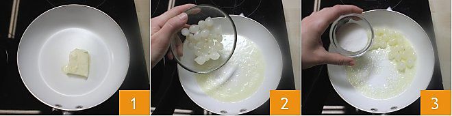 To prepare the olive puff pastries with caramelized onions, start by caramelizing the onions: melt the butter in a pan over low heat 1, add the onions and let them brown for a few minutes 2, then add the granulated sugar 3. Stir occasionally with a wooden spoon, being careful not to let the sugar stick to the bottom of the pan;
