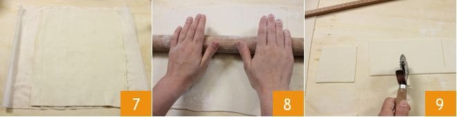 Meanwhile, take the ready-made pastry 7 and transfer it to a floured work surface, then roll it out slightly with a rolling pin 8. Then cut out 3x3 inch squares with a pastry cutter 9.