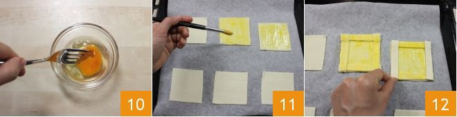 Beat an egg 10 and brush the surface of the squares using a brush 11. With the leftover dough, create strips 1/2 inch wide and 3 inches long and attach them to the 4 edges of the pastry squares 12.