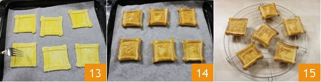 Brush these with the egg as well and decorate them by scoring them with a toothpick. Prick the bottoms of the squares 13 and bake in a preheated static oven at 356°F for 15 minutes until they are nicely golden 14; if using a convection oven, bake at 320°F for 10 minutes. Once baked, remove them and let them cool on a wire rack 15.