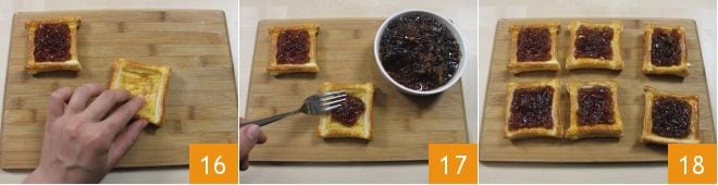 When they are cool, gently break the crust that has formed on the bottom of the squares with your fingertips 16 and fill each pastry with about 1 oz of Tropea onion jam 17. Once all the pastries are topped, serve and enjoy 18!