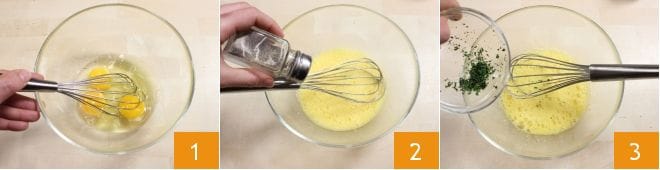 To make the olive puffs with frittata cubes, start with the preparation of the frittata: in a bowl, place the whole eggs, beat them with a whisk 1, add salt, pepper 2, and season with chopped parsley 3