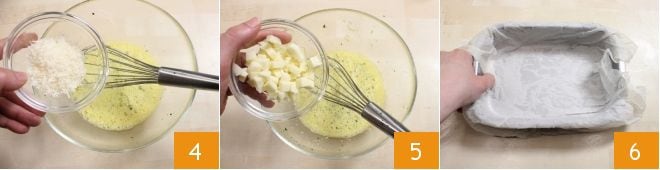 and then finally add the cheeses: grated parmesan 4 and diced scamorza 5. Moisten and wring out a sheet of parchment paper and line a baking dish measuring 6x8 inches 6.