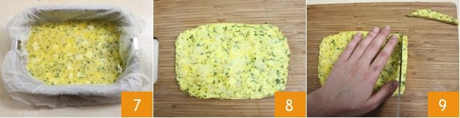 Pour the mixture into the pan 7 and bake in a preheated oven at 350°F for about 25-30 minutes. Remove from the oven, let it cool slightly, and turn it out onto a cutting board 8. Now cut the frittata into strips about half an inch wide 9