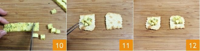 and from these, cut small cubes about 1/2 inch 10. With the help of kitchen tongs, place the frittata cubes on the puffs 11. Your olive puffs with frittata cubes are ready to be crunched! 12