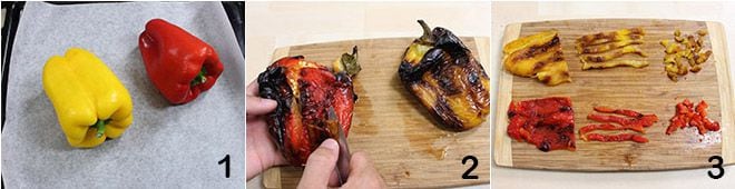 To prepare the olive puffs with ricotta and grilled peppers, wash the peppers thoroughly and grill them in a convection oven at 482°F for 20 minutes 1. When they are ready, peel them, remove the seeds 2, and cut them into strips, then into cubes, keeping some strips aside for the final decoration 3.