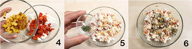 Put the ricotta in a small bowl and add the diced peppers 4, then finely chop the savory and add it to the mixture 5, always keeping some leaves aside for the final decoration. Mix well with a fork to blend all the ingredients and adjust the salt 6.
