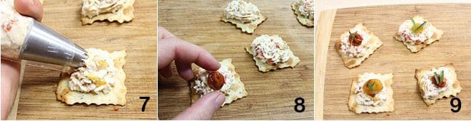 At this point, transfer the mixture into a piping bag with a star nozzle and start composing the puffs by squeezing a dollop of ricotta and grilled pepper cream onto each puff 7, then place a rolled-up strip of pepper in the center 8 and finally some leaves of savory on each pepper 9.