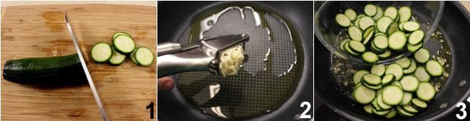 To prepare olive pastries with sautéed zucchini, start by preparing the zucchini: wash them, remove the ends, and slice them about 1/16 inch thick 1. In a non-stick pan, heat the extra virgin olive oil, add the crushed garlic 2 and let it turn golden, then add the zucchini 3, and let them soak in the flavor.