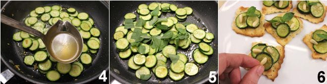 and if necessary, add a couple of tablespoons of vegetable broth 4. When the zucchini are cooked but still crunchy, turn off the heat, salt, and pepper to taste, and add the chopped basil 5. Top each pastry with some sautéed zucchini, a couple of pine nuts 6, and a basil leaf!