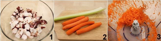 To prepare classic pastries with octopus salad, you can use a pre-made octopus salad or prepare it following the recipe you Octopus salad with parsley (octopus salad) using fresh octopus. You will need 3.5 oz of octopus salad, and you can use any leftover to accompany the appetizers by adding boiled potatoes if you like. Then prepare the julienne of vegetables: wash and peel the carrots and celery 2 that will accompany the octopus: julienne the carrot and celery using a food processor 3