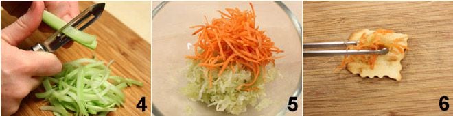 or with a peeler 4, finally place the vegetables in a bowl 5 and season them with oil, lemon juice, and salt. At this point, you can assemble your appetizers: garnish each pastry with the vegetables 6 and the octopus salad, and sprinkle with black pepper to taste.