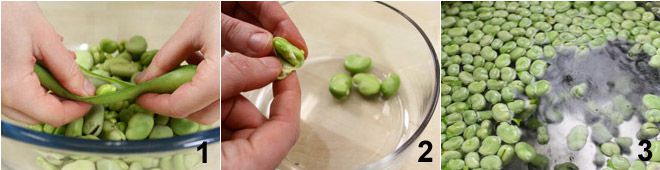 To prepare classic puff pastries with fava bean puree, start by washing the fava beans, then shell them from their pod 1 and extract the seeds 2, then remove the outgrowth covering the fava bean seed. At this point, cook the fava beans in plenty of boiling water 3 for at least 5 minutes and set aside a few ladles of cooking water.