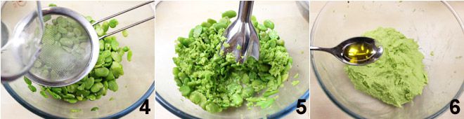 Drain them and pour them into a bowl, add a ladle of filtered cooking water 4 and blend the fava beans 5, adding more cooking water if necessary to adjust the consistency of the cream, which should be quite thick. Once the cream is ready, add salt and a tablespoon of olive oil 6.
