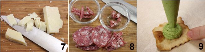 Separately, cut the pecorino cheese into pieces 7 and the slices of Felino salami into cubes 8. Now you can assemble your appetizers: put the fava bean cream in a piping bag and spread it on each pastry 9, finally garnish with the pecorino pieces and salami cubes.
