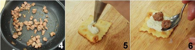 letting it cook until the meat is well red and crispy 4. Then reduce the stracchino to a cream with the help of a spoon and transfer the cheese into a pastry bag. Finally, squeeze the cream onto the classic pastries "La Bottega di Olivia&Marino" 5 and finish by placing two cubes of crispy luganega on top of each pastry 6.