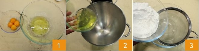 To prepare the French meringue (basic dough), take the eggs and separate the yolks from the whites 1. Pour the egg whites into a stand mixer with a whisk attachment 2 and start whisking them until stiff peaks form; sift the powdered sugar into a bowl 3 and