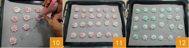 On a buttered baking sheet lined with parchment paper, make small meringue dollops spaced apart: with our quantities, you should get 24 pieces 10. Dry the meringues in a convection oven at 194°F for at least 3 hours, keeping the oven door slightly open. Once ready 11, remove from the oven and let cool: your shaded meringues are ready to be served; you can also use other colors, like blue 12, or mix different tones to create various shades!