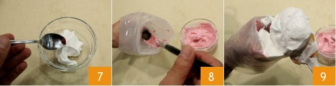 Put a few tablespoons of the meringue you obtained into a small bowl and add liquid food coloring (or paste) according to the color and shade you wish to achieve 7: in our case, we chose red coloring to get pink meringues; mix well with a teaspoon to achieve an even color. Take a piping bag with a star nozzle and with a brush, paint the edges with the colored meringue you prepared 8, then with the help of a spatula, transfer the remaining white meringue (without coloring) that you set aside into the piping bag 9.