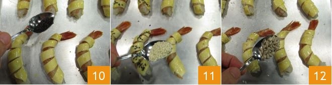 Finally, cover 4 shrimp with black sesame seeds 10, another 4 with white sesame seeds 11, and the last 4 with sunflower seeds 12.