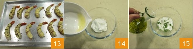 Bake the shrimp in crust in a preheated static oven at 392°F for 15 minutes or until the puff pastry is beautifully golden 13. Meanwhile, you can prepare the yogurt sauce: squeeze the lemon, collect the juice, and add it to the yogurt in a small bowl 14. Add the mint roughly chopped. Season with oil 15, pepper, and salt