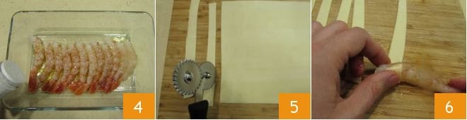 Salt 4 and pepper, mix gently and set them aside. Take the puff pastry and cut it into strips 0.39 inches wide with a pastry wheel 5. Take a strip of dough and wrap it around the shrimp starting from the head 6.