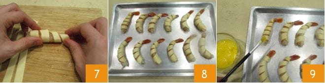 Cover the shrimp completely by wrapping the puff pastry strips in a spiral up to the tail 7. Place the shrimp on a baking sheet 8 as you finish them. Once the shrimp are finished, beat the egg in a bowl and brush the surface of the puff pastry with the beaten egg 9.